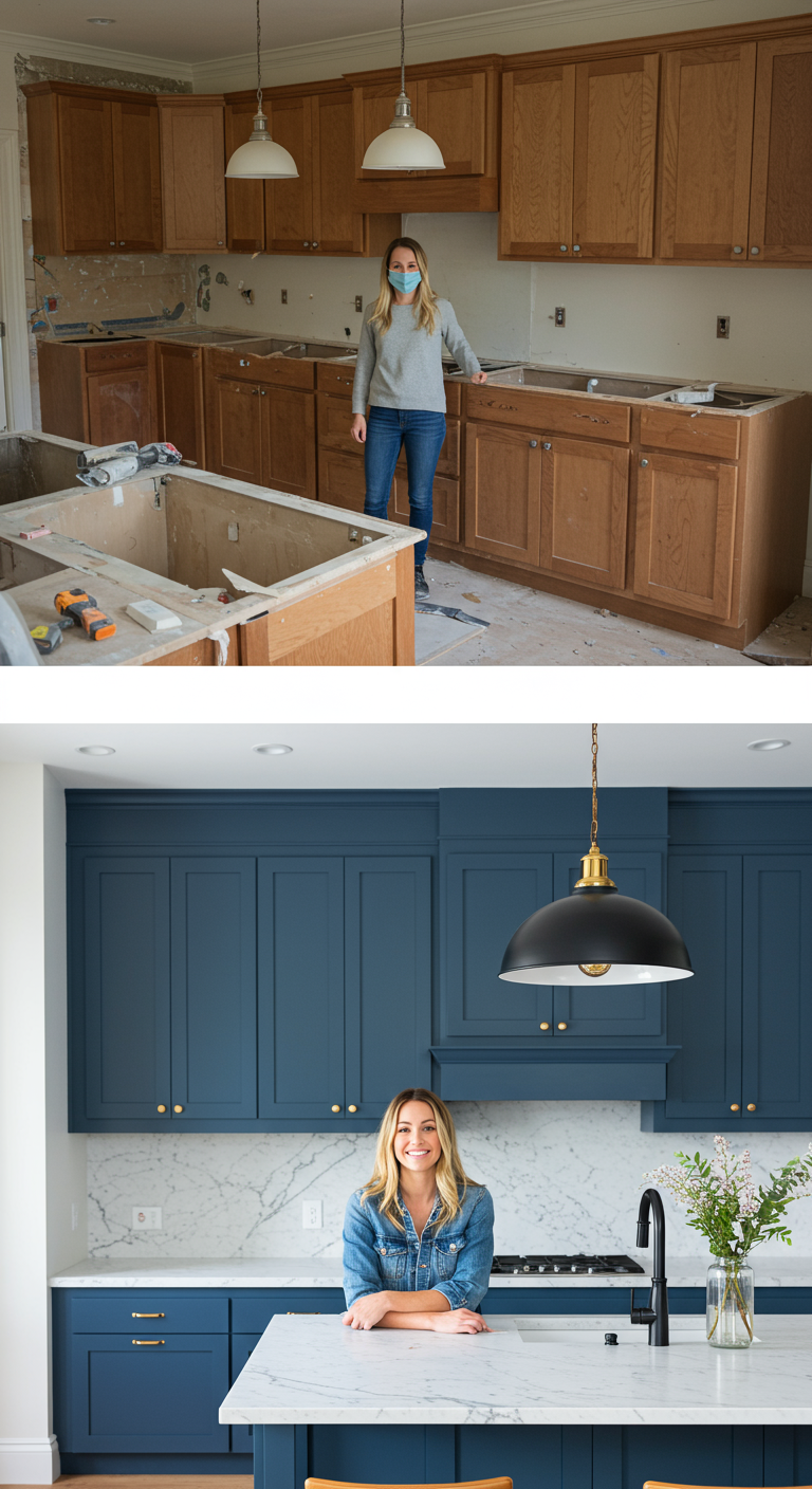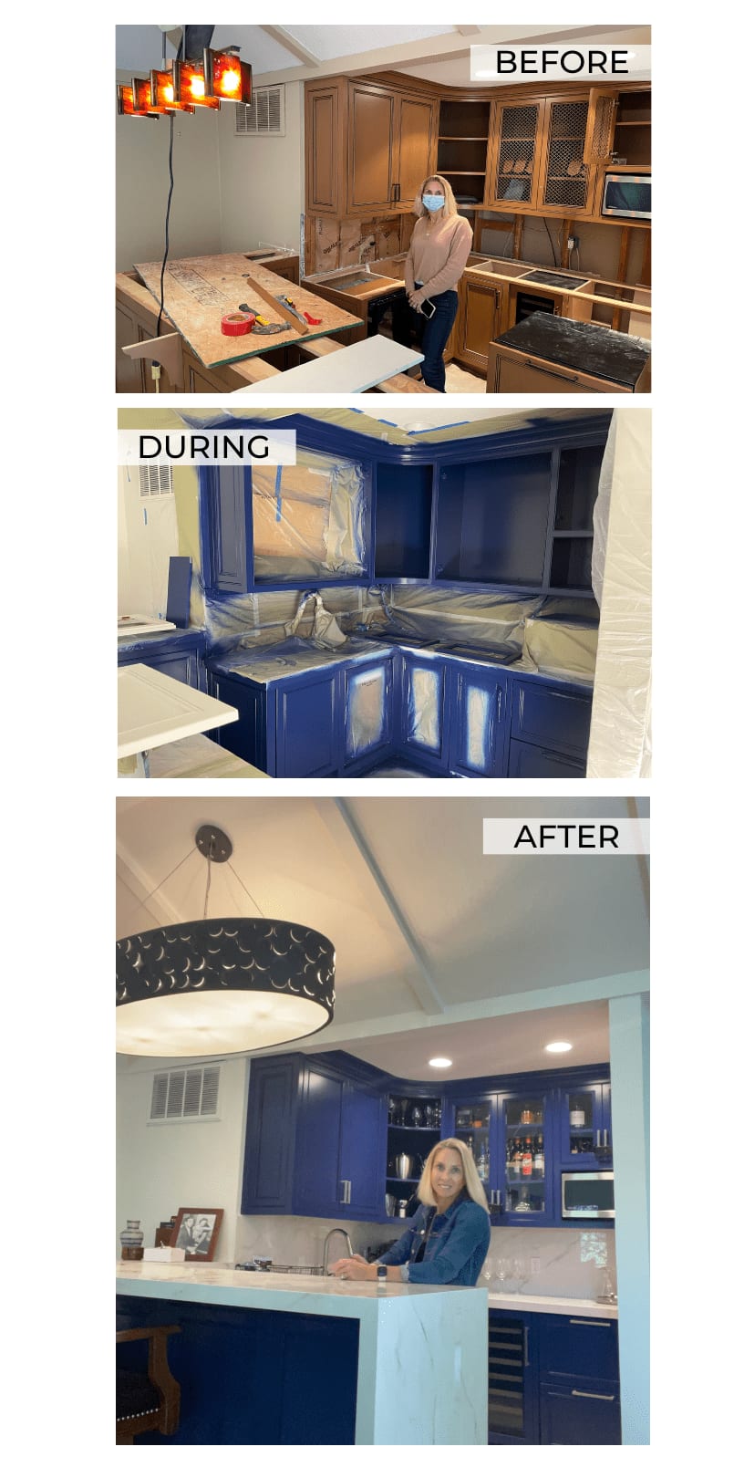 My latest project is a cabana living space designed as a getaway for adults and hangout for teens. The dated kitchenette was spruced up with new, durable porcelain countertops made to look like marble with a waterfall trim, bright blue cabinets and new lighting and hardware accents for a fun, fresh style enjoyed by the entire family.