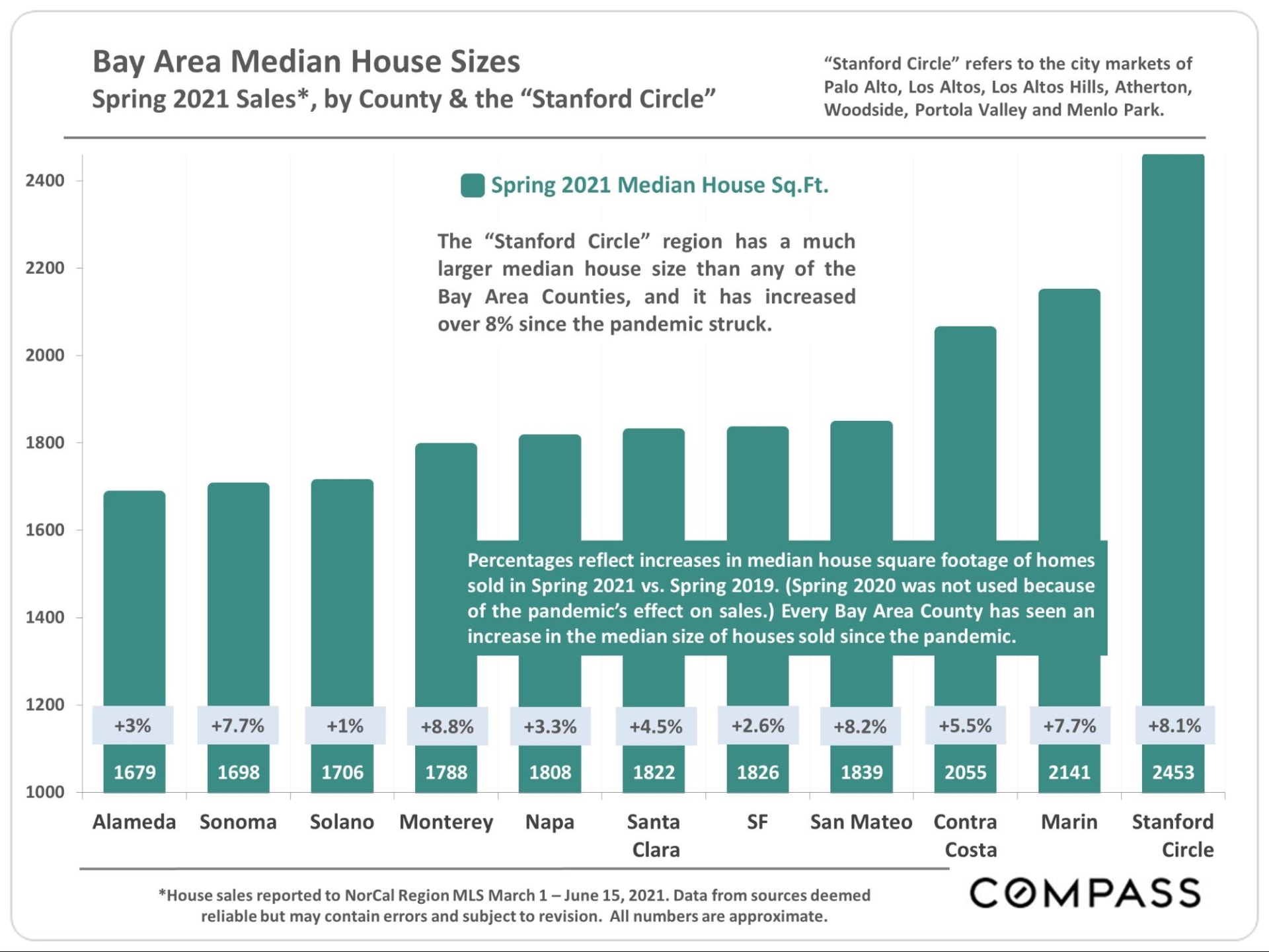 The "Stanford Circle" region has a much larger median house size than any of the Bay Area Counties. This has increased over 8% since the pandemic struck.
