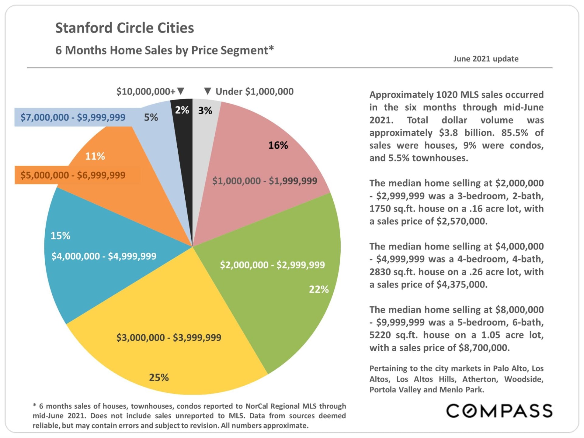 Approximately 1020 MLS sales occurred in 6 months, through mid-June 2021. The total dollar volume for the Stanford Circle area was around $3.8 billion.