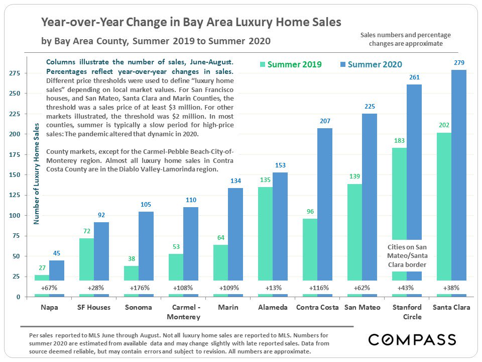 Bay Area luxury home markets: Year-over-year summer sales volumes and percentage changes. Broken out as a separate market, the Menlo Atherton area saw a substantial 43% Y-o-Y increase in sales.