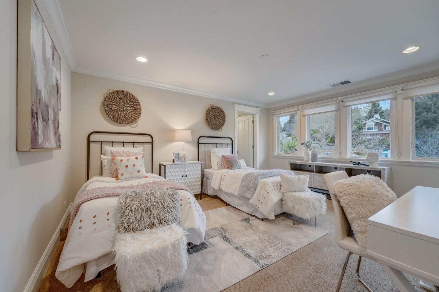 Luxury, scale, and privacy in one of Emerald Hills most desirable neighborhoods with level lots and non-through streets. Built in 2008, and overlooking tranquil wooded open space, this architectural gem spans graceful levels with 5 bedrooms, an office, and 5.5 baths across approximately 5,350 square feet of living space. Towering ceilings and expansive use of glass are a signature of the home, complemented by the contemporary panache of pendant lighting and clear glass railings on the stairs. Hardwood floors unify the public rooms, facilitating a seamless flow from the formal living and dining rooms to the tremendous kitchen and family room, and downstairs to a bespoke wine cellar. The versatile layout accommodates a lower-level bedroom suite with private entrance perfect for au pair quarters, plus a home office or den suite, and a top-floor primary suite conveniently close to three additional bedrooms. Spacious laundry room with sink and three-car attached garage. Multi-unit heating and cooling. Effortless outdoor living awaits on vast decks, framed with cable-strung railings and a backdrop of open space. Privately positioned on over one-half acre, this home also benefits from being within the esteemed Roy Cloud School (K-8) district.